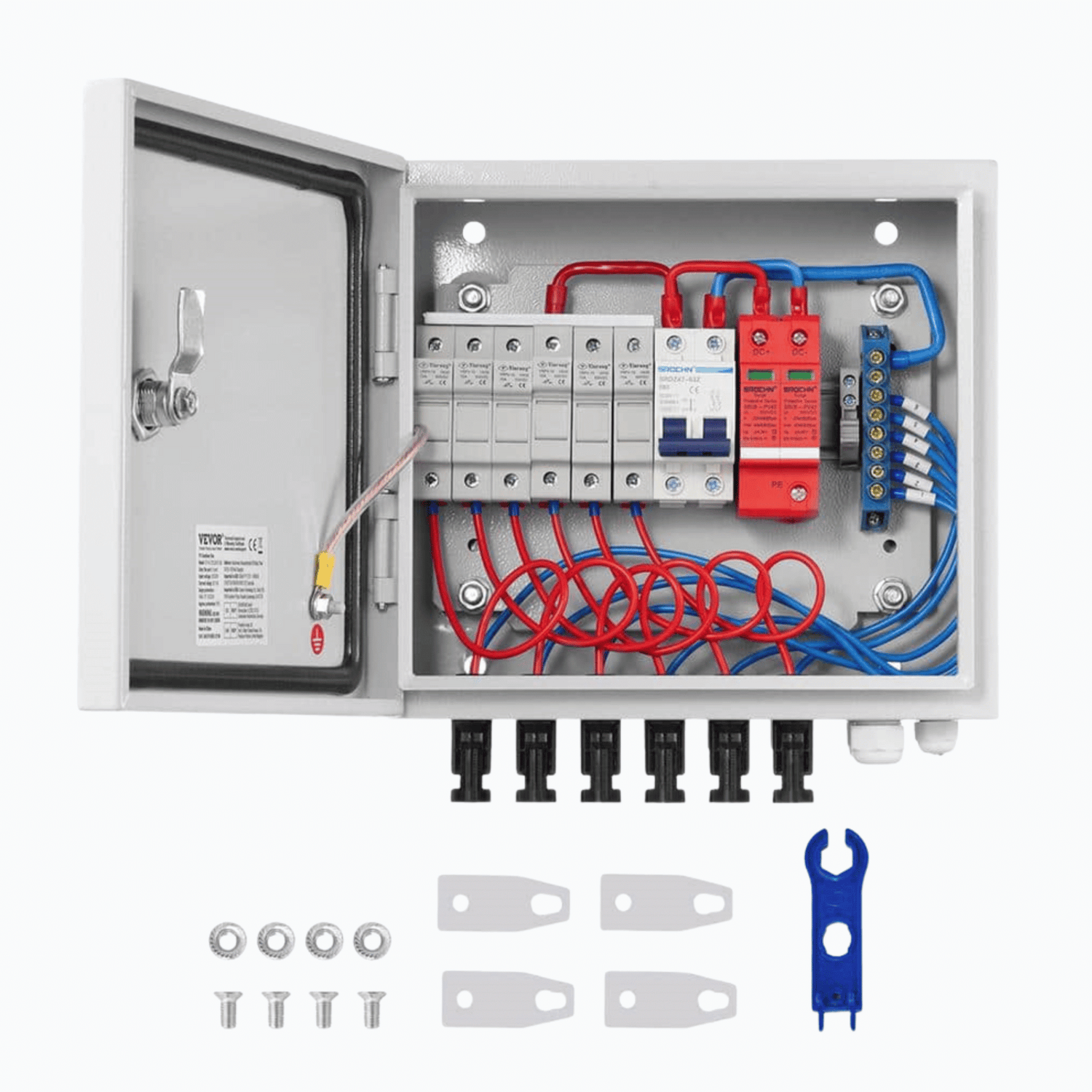 This combiner box is designed to combine the outputs of up to six individual solar panel strings into one, simplifying wiring and enhancing system safety. It features integrated overcurrent protection, surge protection, and is housed in a durable, weather-resistant enclosure, making it suitable for various solar applications.