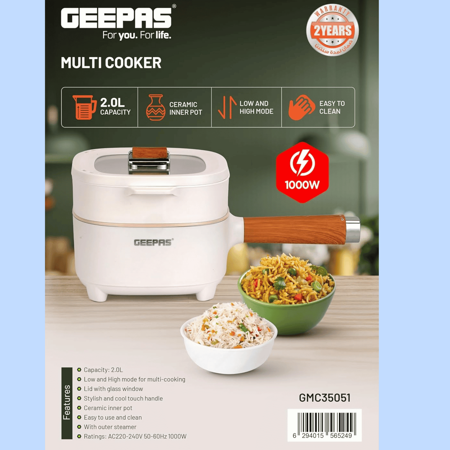 Impressive functionality and an aesthetically pleasing design. The ideal multi-cooker to elevate your dishes into magnificent treats. Prepare healthy and delicious food with the Geepas multi-cooker. This multi-cooker is constructed of premium-quality materials and is designed and manufactured with the objective of being convenient, dependable, and safe, and to make your everyday cooking easier. The 1000-watt multicooker ranks high in both looks and efficiency. It has a large capacity of 2.0 liters and is ideal for preparing perfectly prepared, healthy rice for the entire family. The cooker ensures healthy cooking and seals in nutrients and vitamins. Featuring low and high cooking modes, the cooker is ideally suited for preparing rice, vegetables, meat, fish, lentils, chicken, etc. and can be cooked into different textures such as cake, soup, slow-cooked pasta, steamed pasta, etc. The multi-cooker is highly durable, corrosion-resistant, and can serve you well for many years. The lid features a convenient glass window, which allows you to monitor the process without lifting the lid, preserving the heat and flavors. The ceramic inner pot ensures even heat distribution for perfectly cooked meals every time. The inner pot is highly durable and easy to wash and maintain. The inner pot does not flake off and is hygienic and safe to use. The strong and sturdy construction provides you with an effortless cooking experience. The product comes with a fully sealed structure that ensures better heat retention during the process and retains the freshness, nutrients, aromas, and flavors of the food. The handles on the pot and lid are made of heat-resistant material, which makes them easy to handle. The elegant design, white color, and utility features make it a great option for your kitchen, and it is also a great choice for gifting. The Geepas multi-cooker comes with a 2-year warranty.