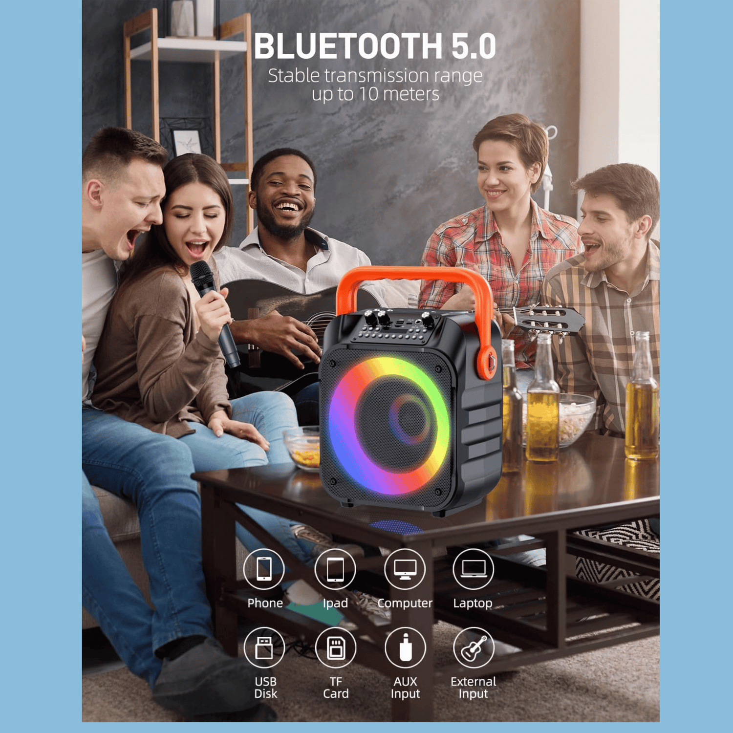 • 【Six Modes of Color Disco Lights】The portable pa system is equipped with six color modes of colorful disco lights that can switch between different colors of lighting. The colorful lighting and wonderful music dance create a romantic party atmosphere, allowing you to immerse yourself in a pleasant atmosphere and experience the ultimate Karaoke party with karaoke speaker