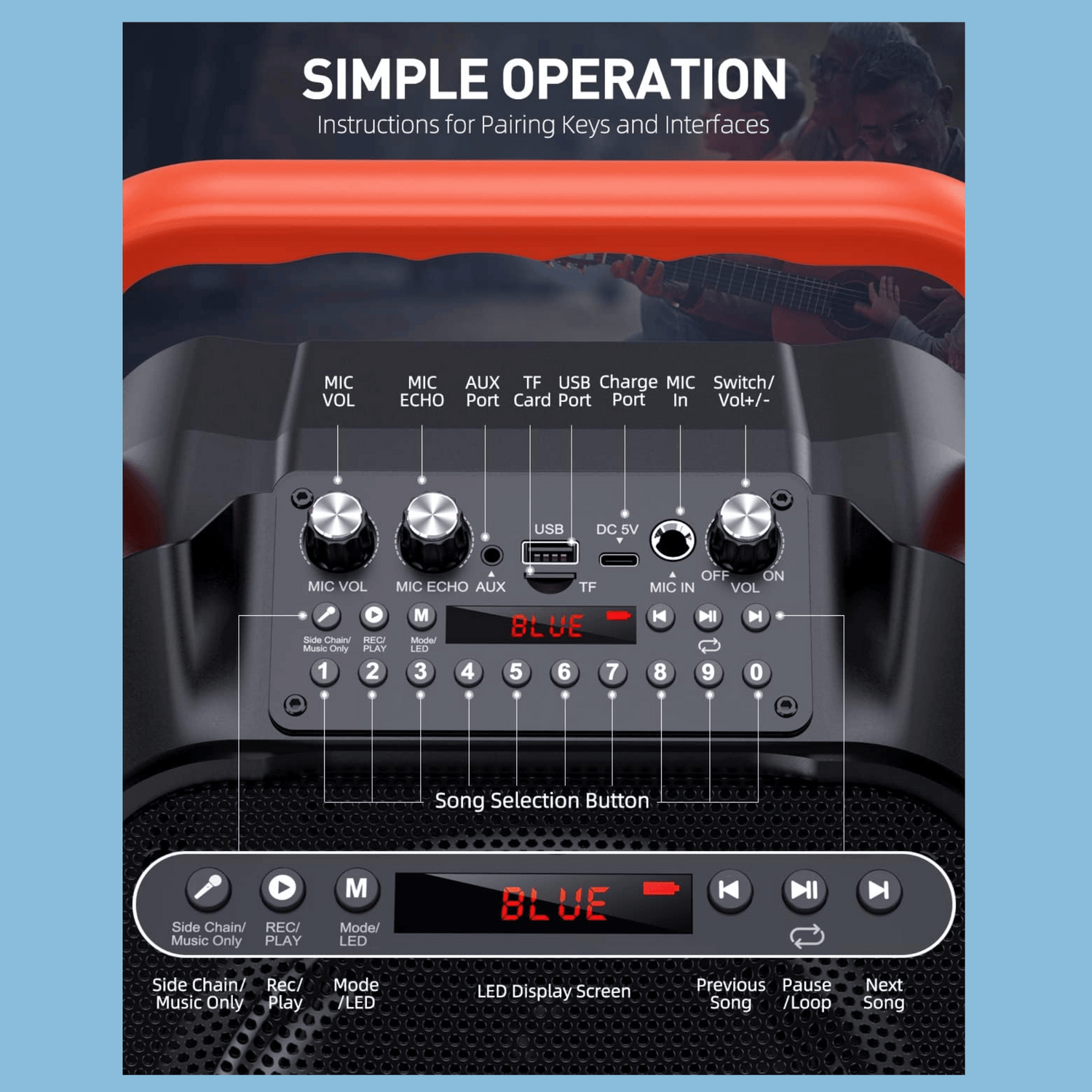 • 【Multifunctional Karaoke Machine】The karaoke machine for adults & kids connect wirelessly via Bluetooth 5.0, providing more stable and long-distance transmission to ensure uninterrupted gatherings. It also supports Micro TF cards, Flash USB, and AUX connections, and is compatible with Android phones, iPhones, iPads, TV, and PC. It is an ideal choice for personal gatherings, street performances, and gym teaching